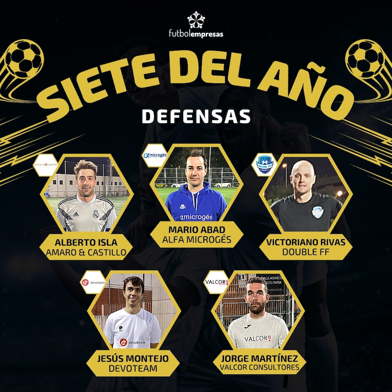 Los grandes protagonistas del año en la zona defensiva han sido Alberto Isla (Amaro & Castillo), Mario Abad (Alfa Microgés), Victoriano Rivas (Double FF), Jesús Montejo  (Devoteam) y Jorge Martínez (Valcor Consultores), candidatos a dos puestos en el Olimpo de Futbolempresas. Menudos meses se han marcado los cinco, que además de erigirse como muros infranqueables han sido capaces de aportar a sus compañías un buen número de goles y dosis incalculables de buen fútbol. Los dos que además reúnan la mayor cantidad de votos cerrarán diciembre de dorado.