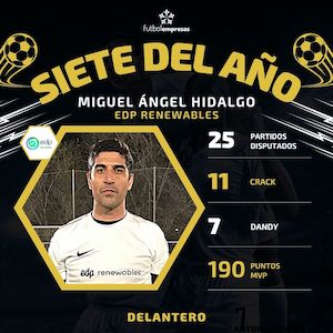 Miguel Ángel Hidalgo (EDP Renewables) y David Molina (BBVA), la gran pareja del gol: los tantos en el ‘Siete del Año’ 2022 corren a cargo de dos máquinas infalibles que, si unimos sus registros en este periodo, han sido capaces de superar la barrera del centenar de dianas. Por encima de todos los aspirantes a entrar en esta alineación, no solo en el puesto de delanteros, ha destacado Miguel Ángel Hidalgo, quien, además de acostumbrar a capitanear a un EDP Renewables que ha goleado a su antojo, también se ha alzado como el hombre más popular de la consulta (325 votos). La encuesta en la delantera ha movilizado a los votantes, dando lugar a una pugna preciosa que ha terminado con una gran remontada de David Molina (319 votos) para hacerse con la última plaza disponible y representar a BBVA en esta alineación ideal. A pesar de contar con numerosos apoyos, no ha habido hueco para poder incluir a Jesús Jiménez (Kuehne+Nagel) con 171 votos, a Iván Delgado (Altran) con 40 o a Javier Barral (Alfa Microgés), al que sus máximos registros tanto en goles como en puntos MVP solo le han bastado para aglutinar 19 votos.