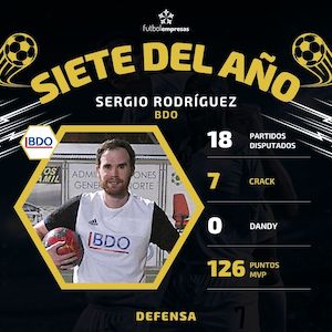 Sergio Rodríguez (BDO) y Álvaro Varona (Cervezas Colegiata) forman una zaga dorada: la gran dupla inexpugnable en la retaguardia, según los votantes de Futbolempresas. El más querido entre los cinco grandes candidatos al puesto ha sido el crack auditor Sergio Rodríguez (38 votos), líder absoluto de un BDO que vuela cuando su ‘4’ está en la cancha. Y es que, pese a no ser el defensor con más puntos MVP del 2022, sí ha sido el que ostentó un mayor porcentaje de puntos por partido (4’22) entre los asiduos a la competición. El otro protagonista en el ‘Siete del Año’ ha sido el cervecero Álvaro Varona (27 votos), quien ve reconocido así su excelente curso defendiendo la elástica de Cervezas Colegiata, uno de los conjuntos más correosos en campeonato gracias, en gran parte, al trabajo incansable de su ‘20’ sobre el césped. A las puertas de vestirse de dorado quedaron los defensas Carlos Olmeda (Iberdrola) y Fernando Daniel Rodríguez (Volkswagen FS), con 16 puntos cada uno, junto a un Jorge Martínez (Valcor Consultores) que reunió 14.